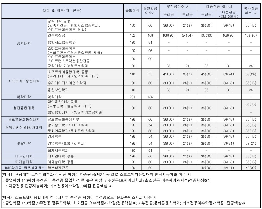 | 대학 | 학과 | 단일전공 | 부전공이수시 | 다중전공이수시 | 복수전공 | ||