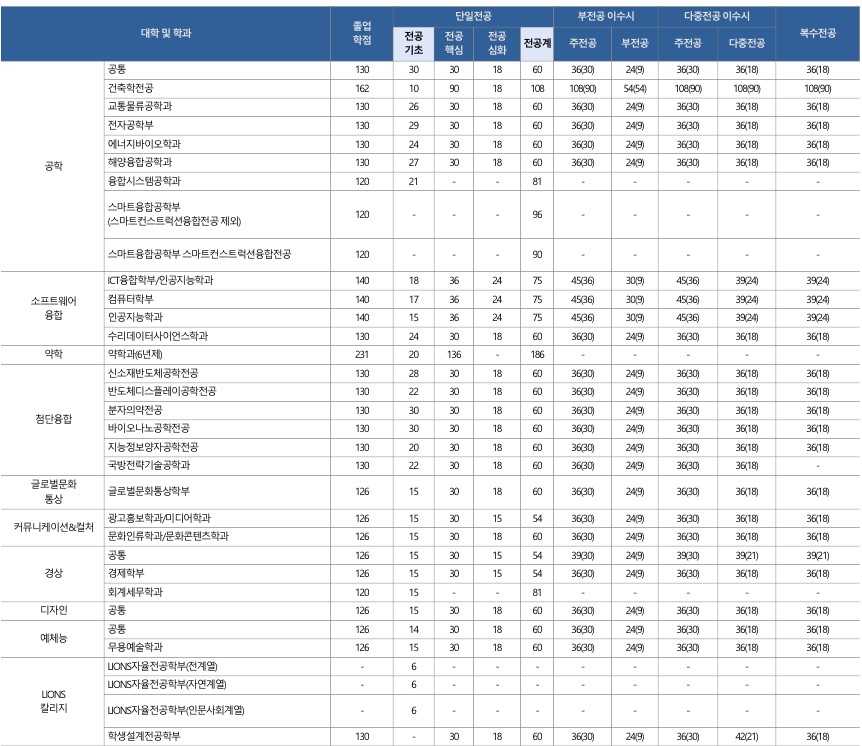 대학 | 학과 | 단일전공 | 부전공이수시 | 다중전공이수시 | 복수전공 | ||